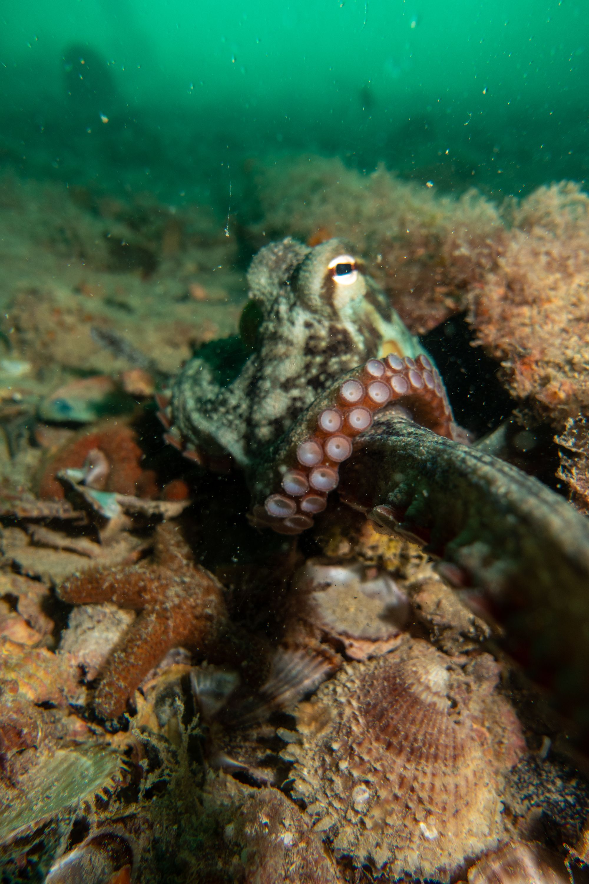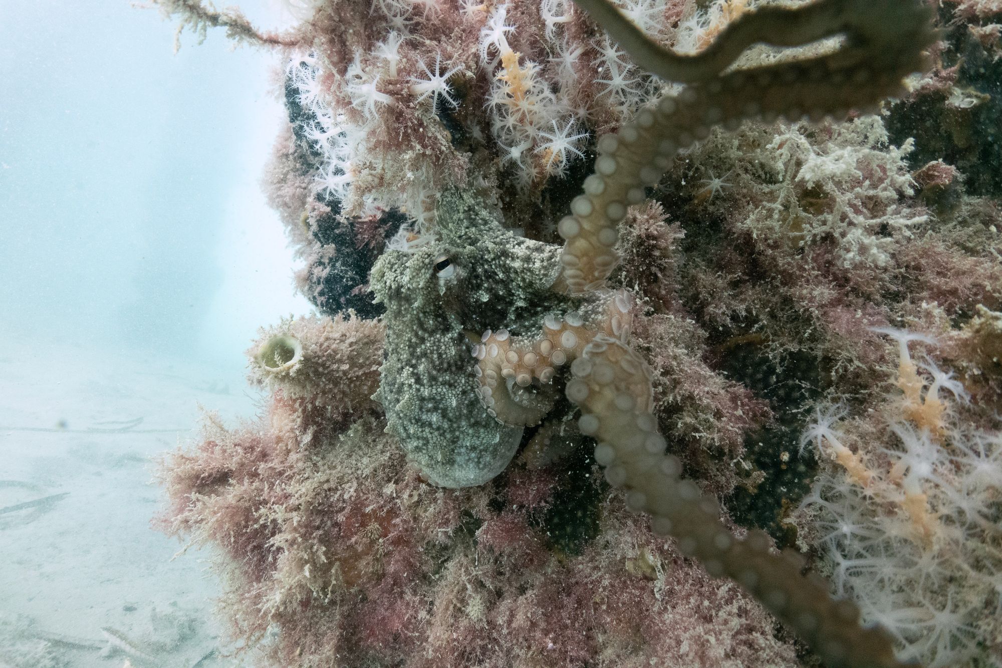 The biggest draw of this site for many divers is the octopus. They makes dens in nooks and crannies, but often venture out for food or curiosity. You can spot them first by the pile of recently-eaten shell around the den entrance.