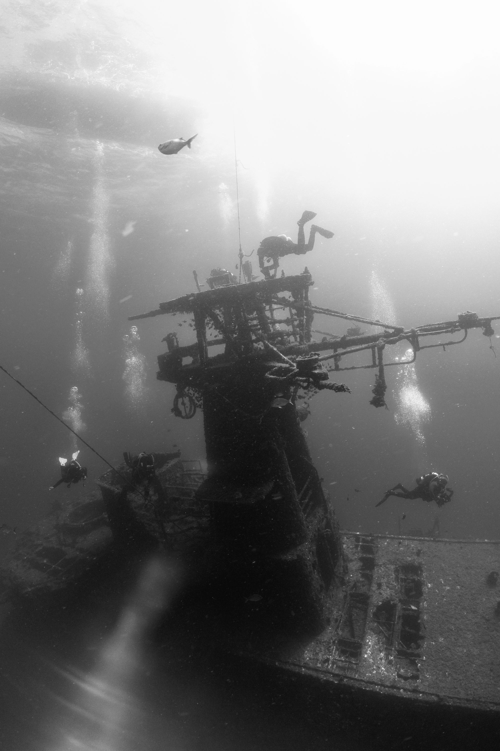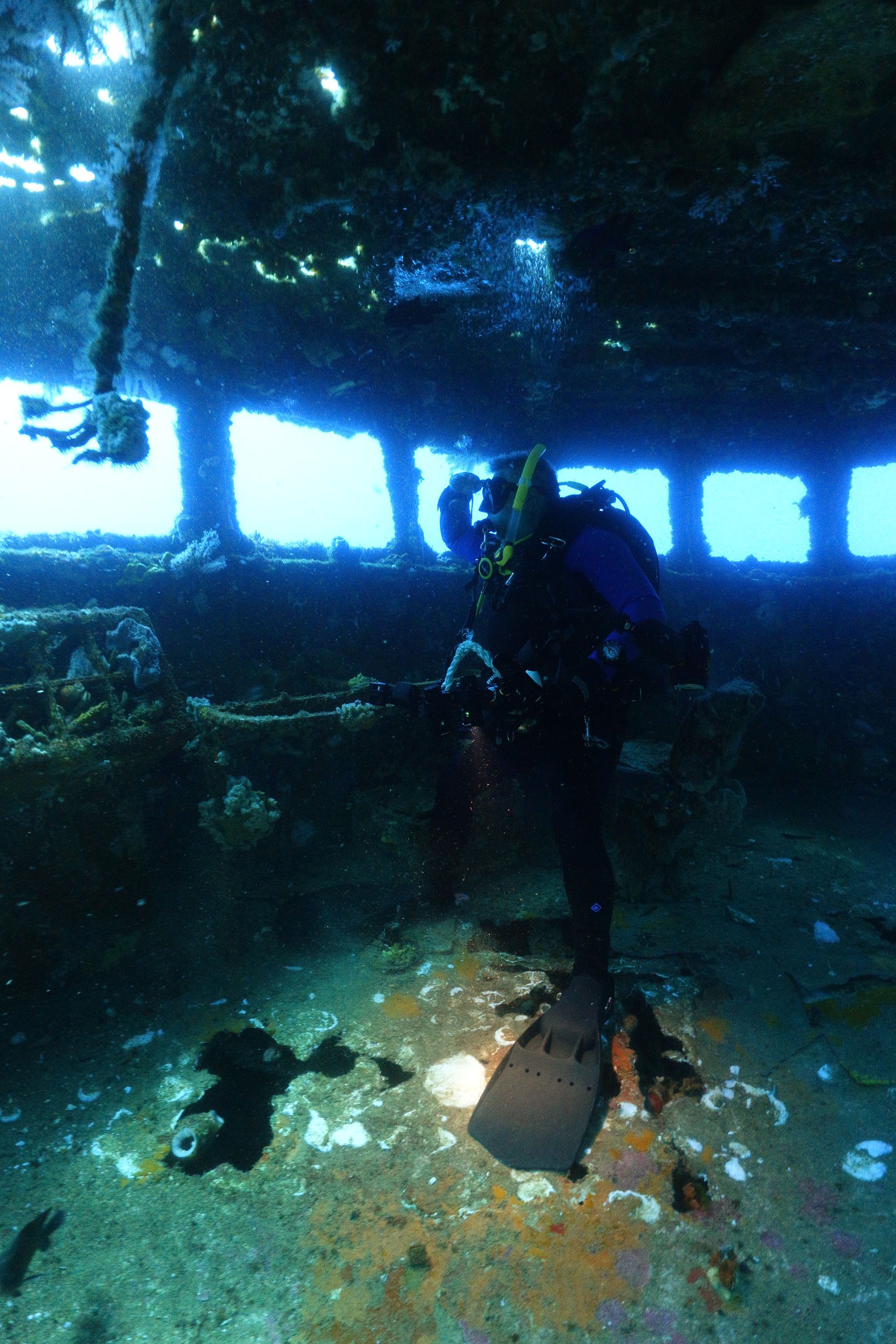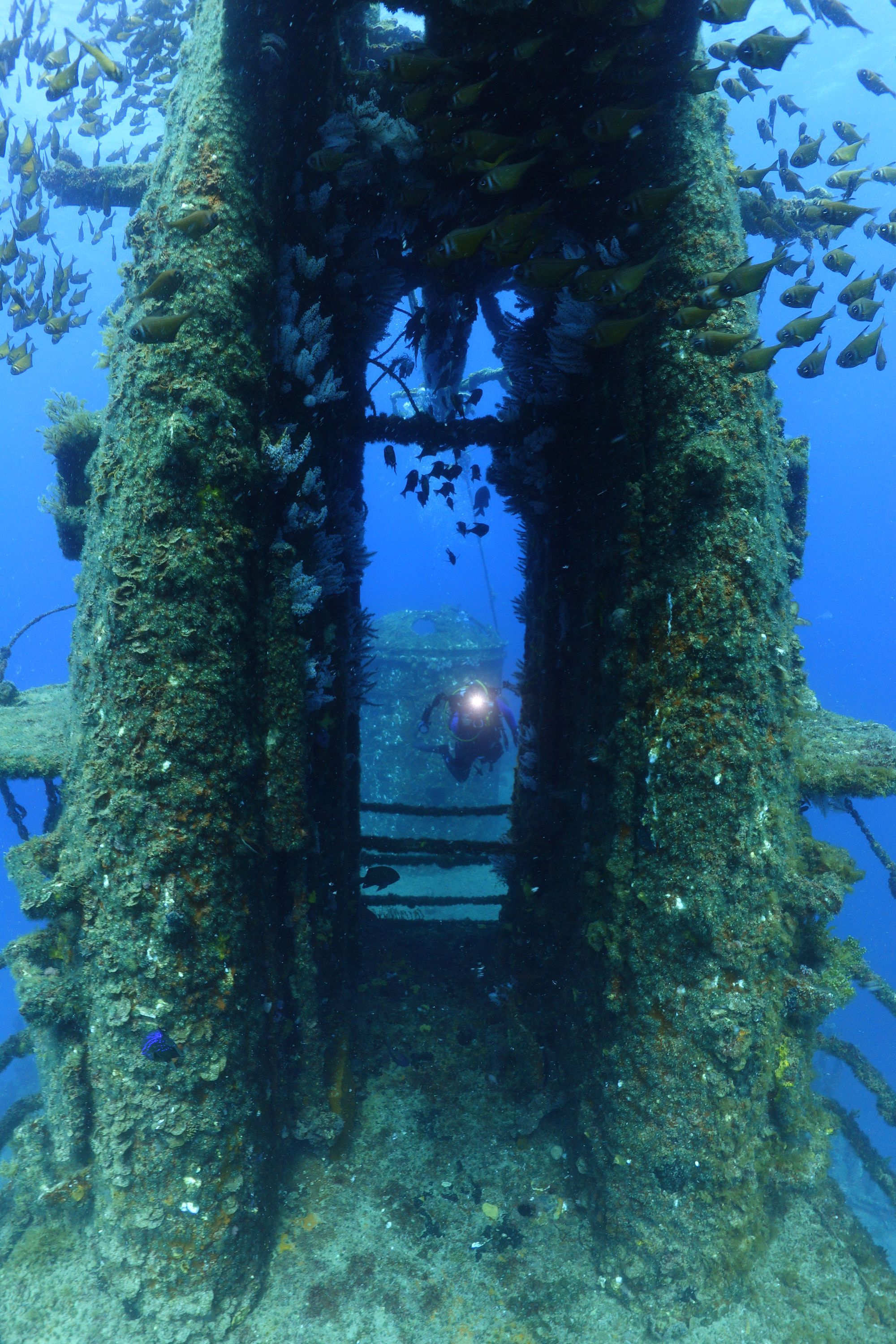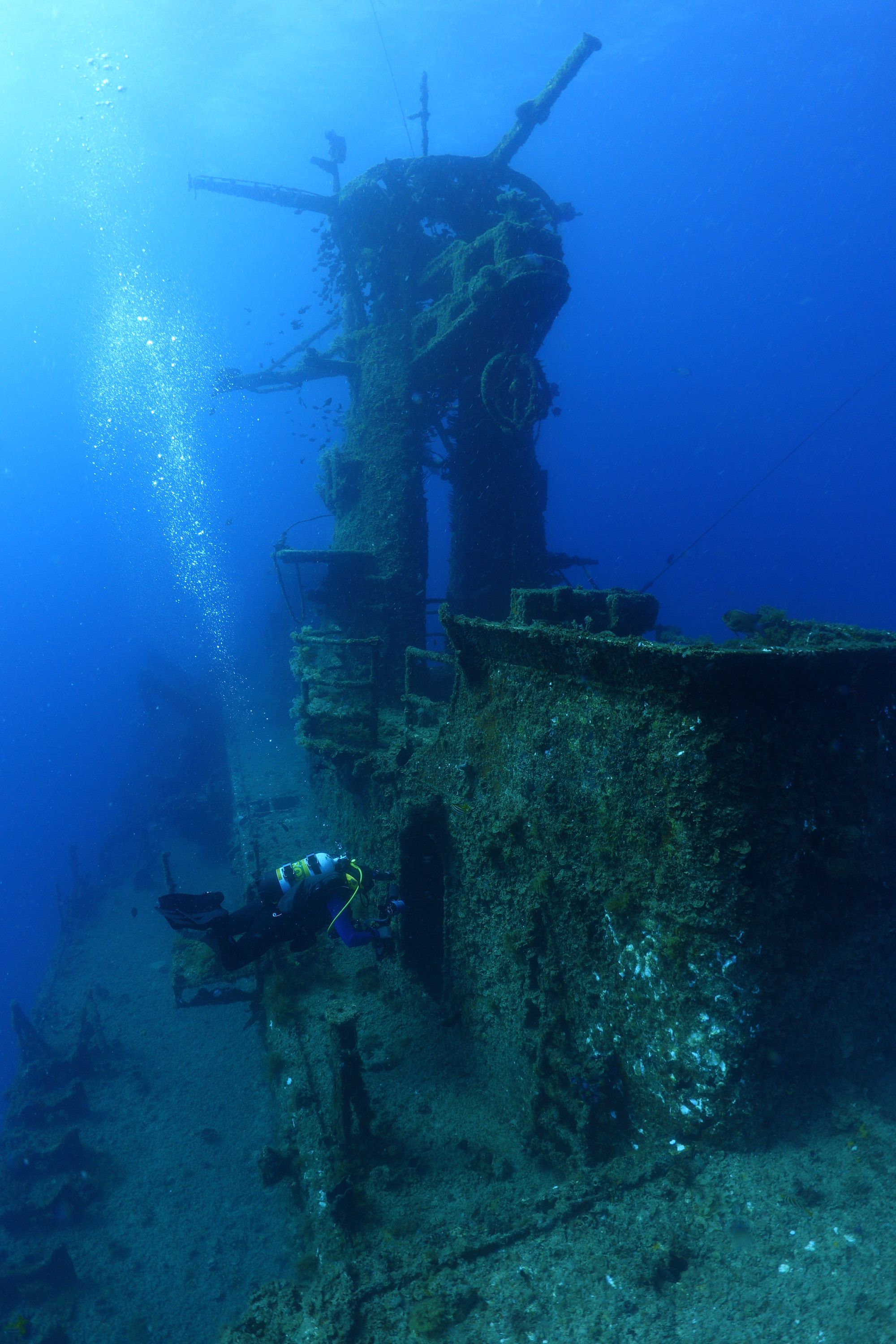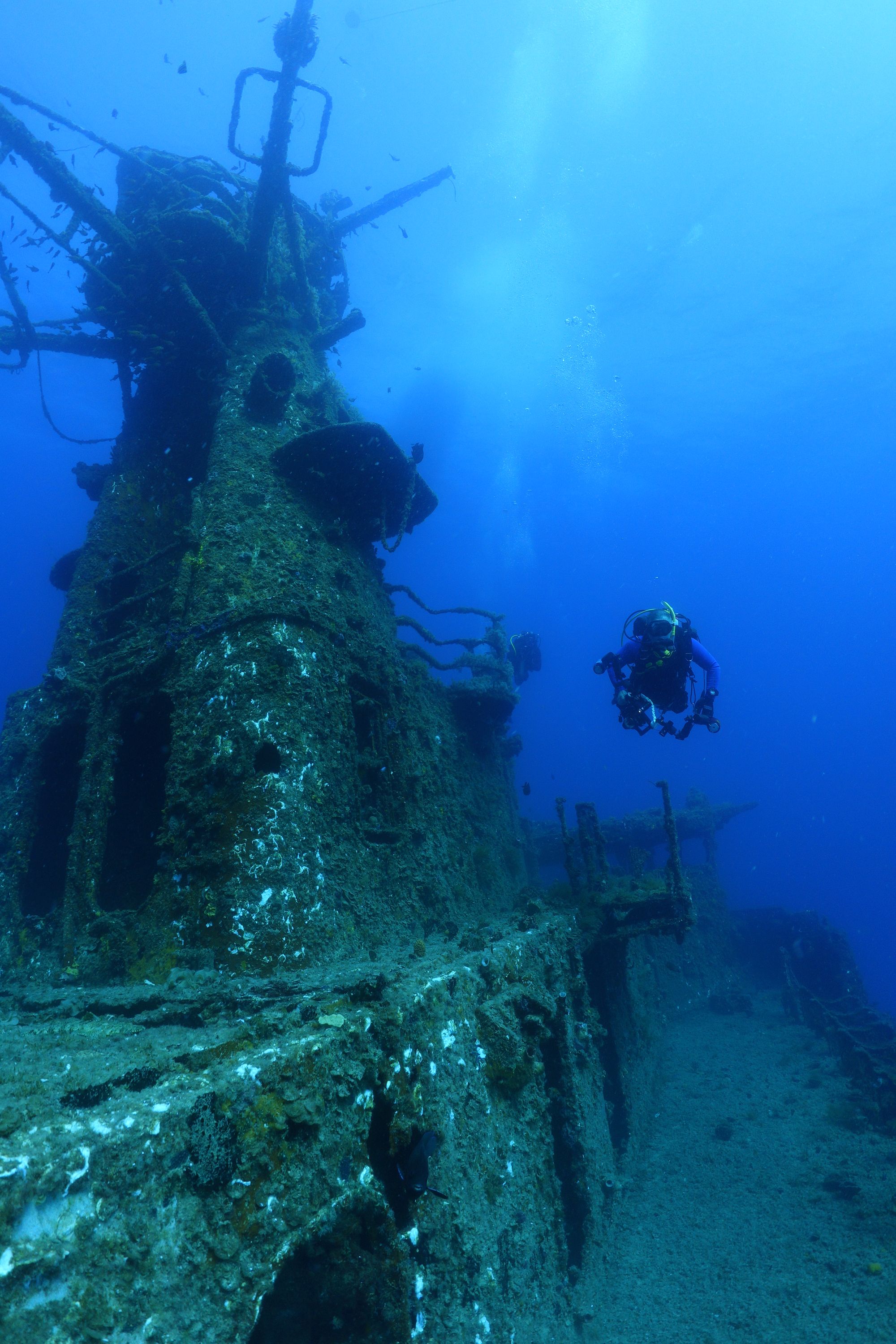 The crows nest is only about 7m underwater, and the bridge can be explored by Open Water Divers. If you are not yet qualified to 30m, some shops even offer the Advanced Open Water course on this wreck, which is a great deal.