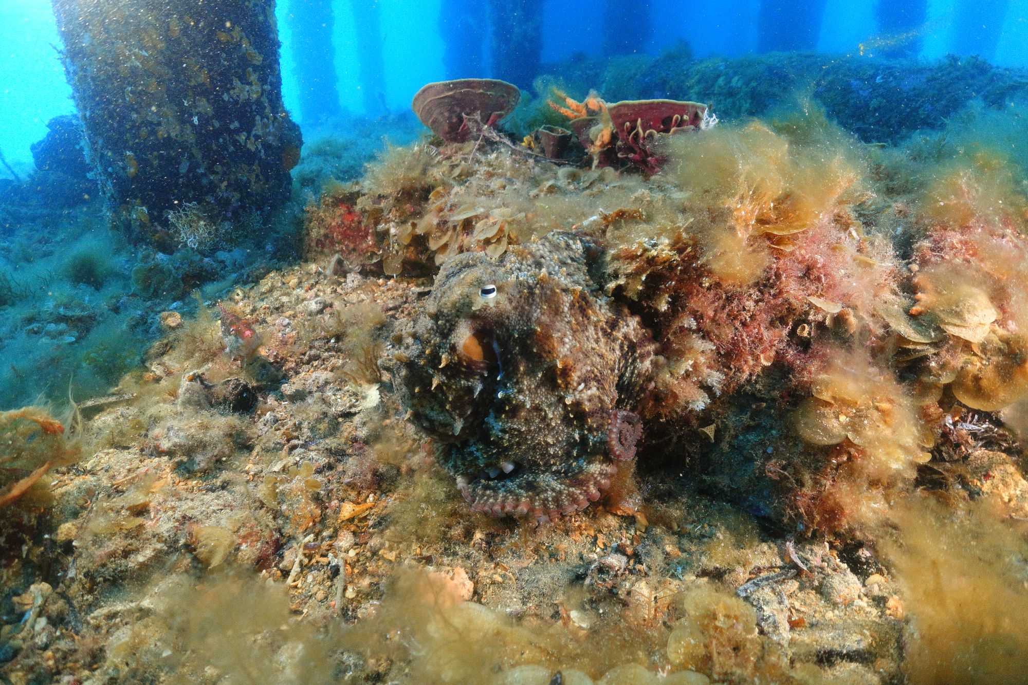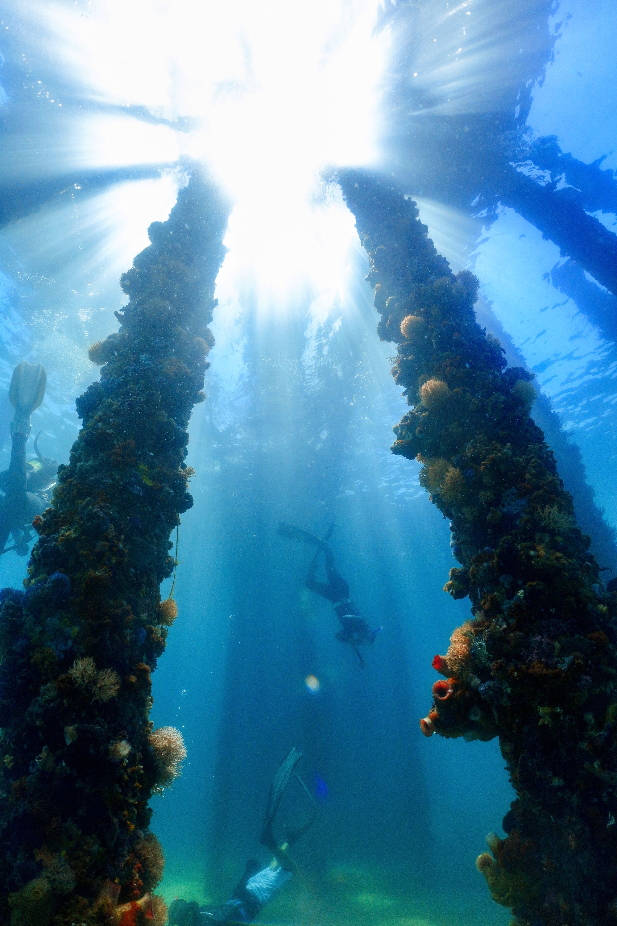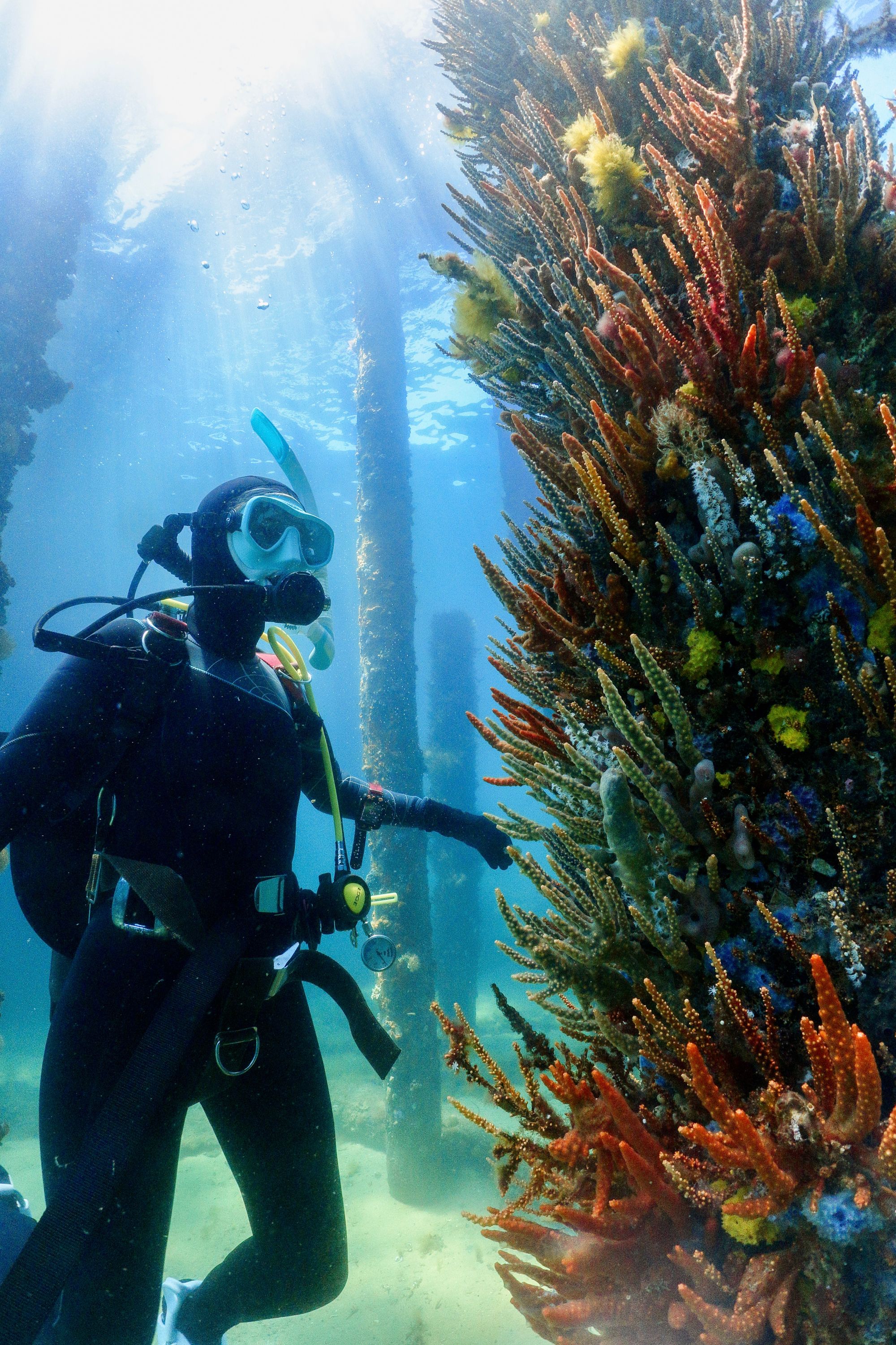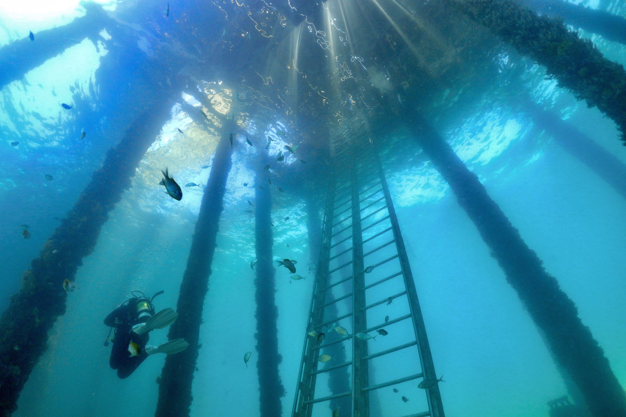 The jetty pylons are covered with coral, and the shelter of the jetty is home to abundant sea life. The Leeuwin Current brings warm water from the north, sustaining a remarkably tropical ecosystem for such a southerly latitude. For friends that don't dive, they can still join by touring the underwater observatory, right next to the dive platform.