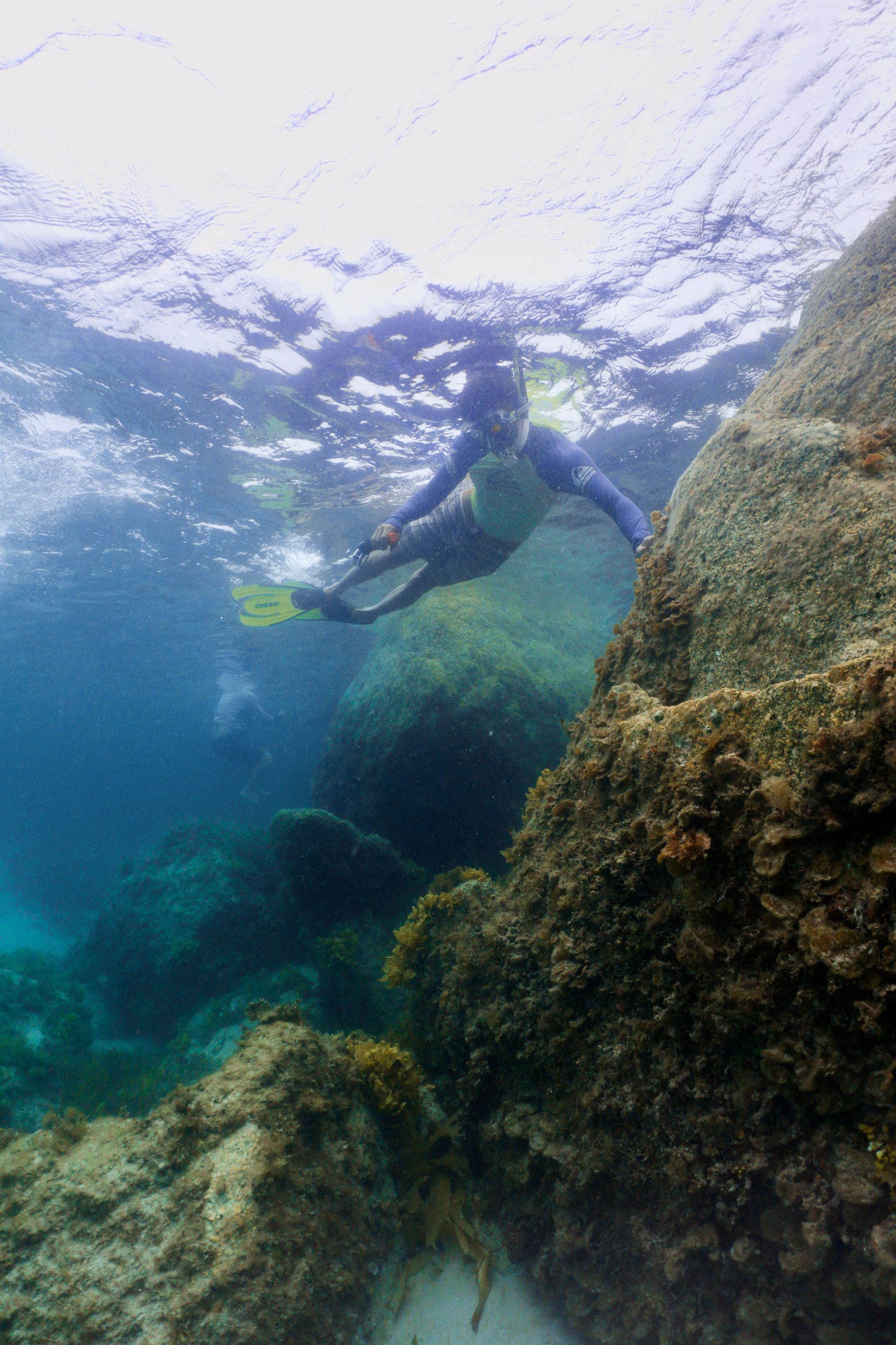 The granite is fun to explore, and some boulders have sheer sides deep enough to jump from. It's a safe and approachable snorkel - with the crowds to match. You should arrive very early to get a park close by.