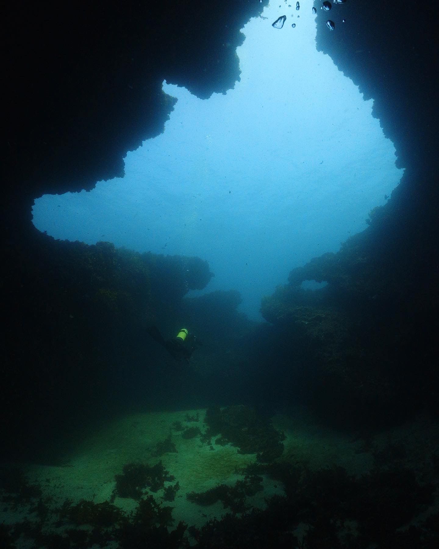 The main cave is the most spectacular feature. In the south-facing ridgeline there are many small caves and swim throughs, but this one is huge. You enter an arch from the sand patch, at about 12m depth, and it opens up into an enormous space.
