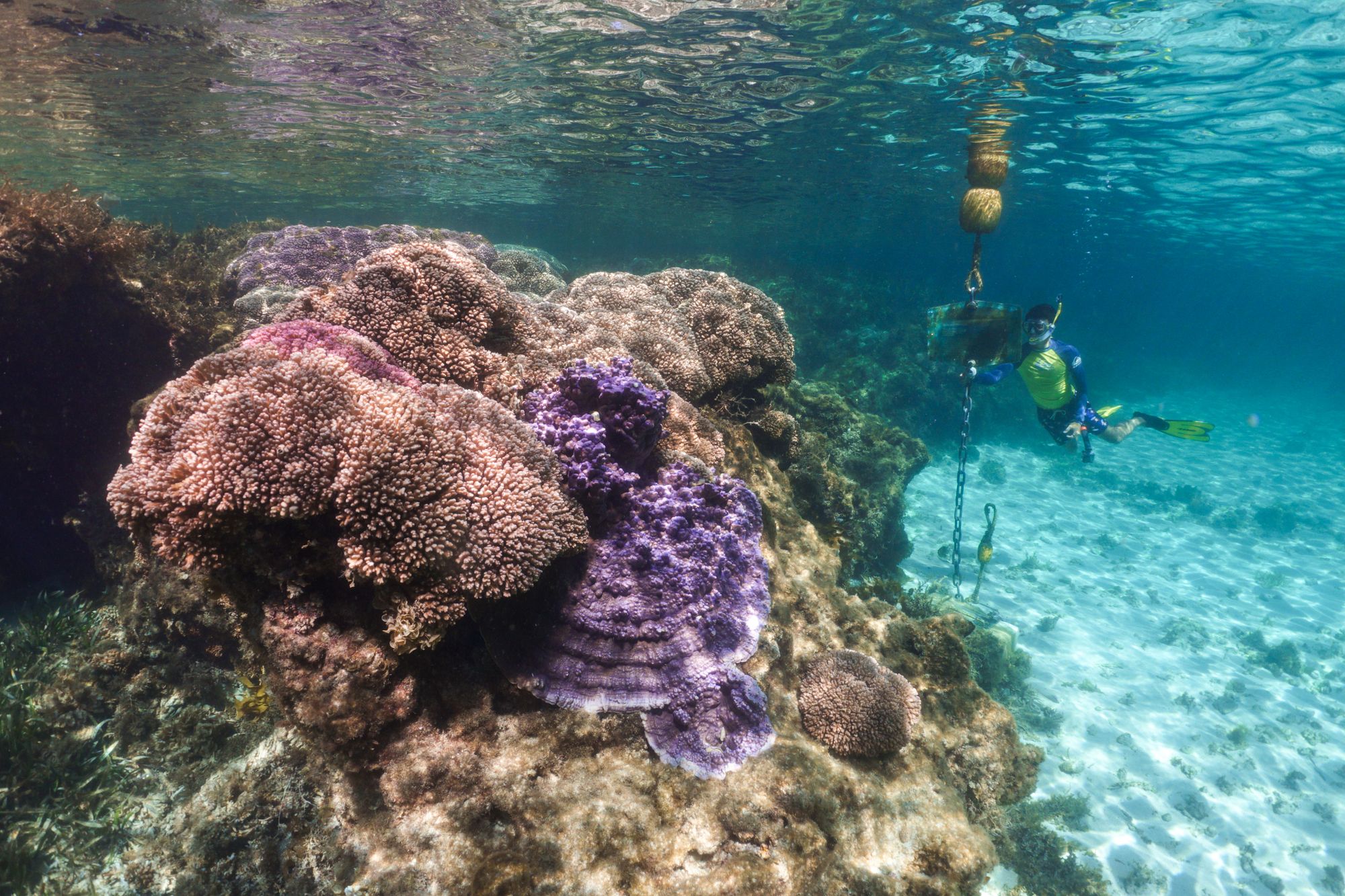 The warm Leeuwin Current supports a surprisingly tropical ecosystem for this latitude. Big schools of fish are always swimming through the pink Pocillopora corals. Eagle rays can be seen on the sand patches, and in the seagrass meadows to the east.